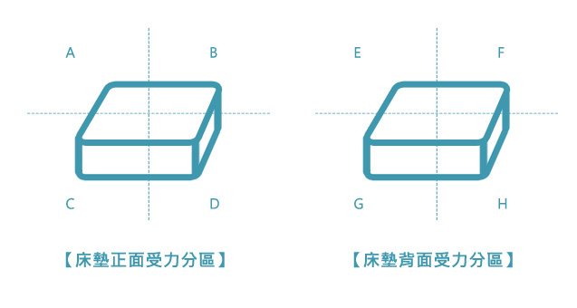 使用六個月後,我們需要將床墊頭尾對調,把E、F兩區的受力,轉移到G、H。